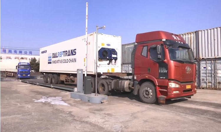 2024年2月12日,6輛滿載魷魚制品的集裝箱貨車緩緩駛?cè)氍q春鐵路互市貿(mào)易區(qū),在這里等候的琿春吉電數(shù)字邊貿(mào)科技服務有限公司工作人員,按要求指揮車輛進入一線查驗區(qū)。隨后,經(jīng)過層層抽檢合格后的貨品將進入交易裝卸區(qū),裝入事先在此等候的廂貨內(nèi),再次由海關(guān)確認無誤后,駛離琿春鐵路互市貿(mào)易區(qū)。